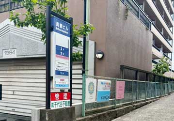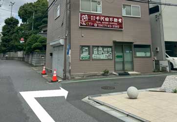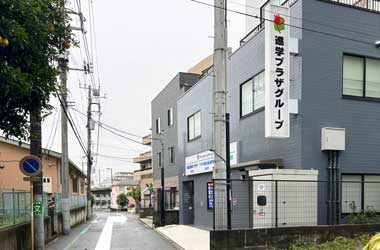 右手の進学プラザグループの隣の建物の先に「長妻ビル」の看板があります。